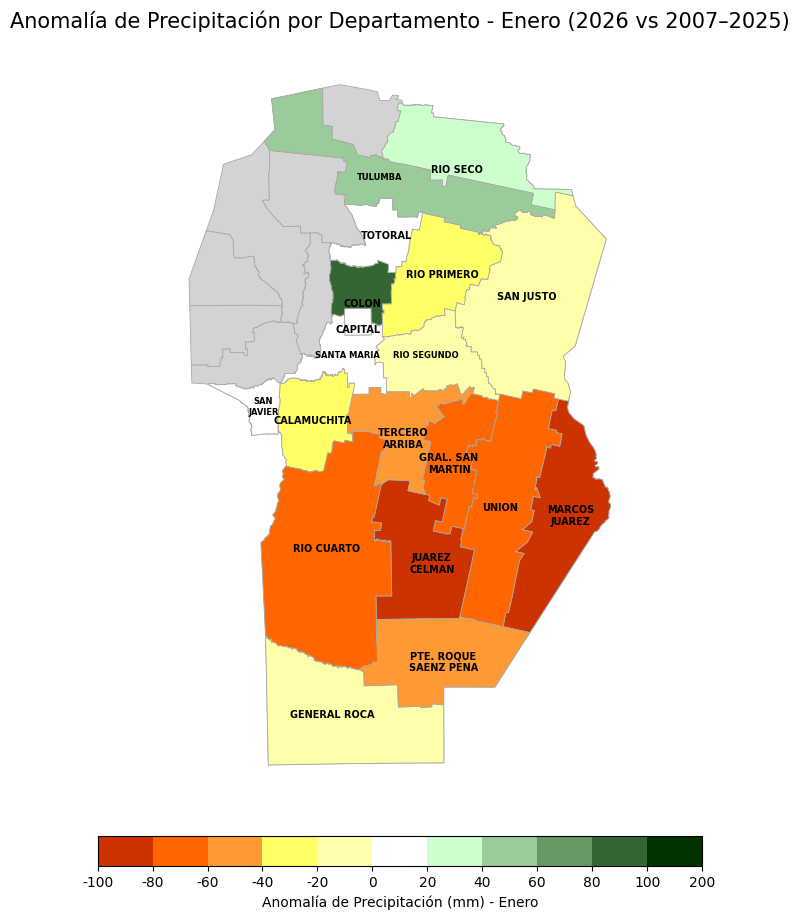 Figura 4. Anomalías de lluvias por departamento (promedio 2007-2025).