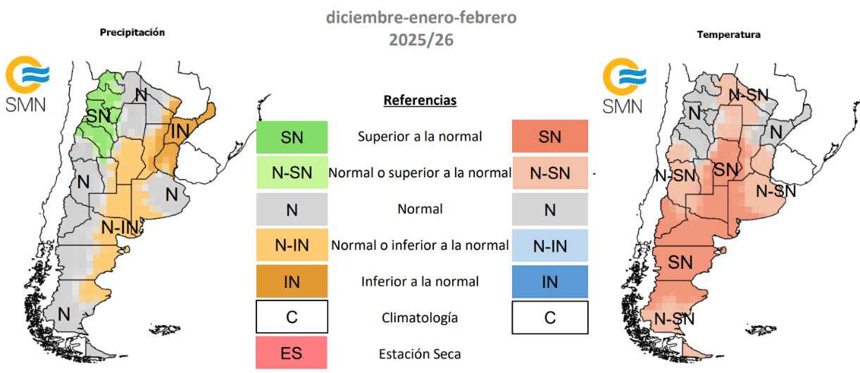El 28 de noviembre el Servicio Meteorológico Nacional (SMN) publicó el Pronóstico Climático Trimestral el cual indica para los próximos tres meses 40-45% de probabilidades lluvias normales a inferiores a lo normal. Mientras que para las temperaturas la probabilidad de que sean superiores a la normal es de un 45-50%.