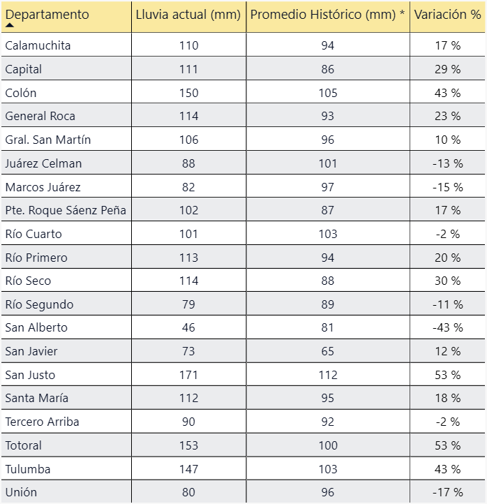 Las lluvias en noviembre de este año se presentaron de forma heterogénea, con eventos dispersos durante el mes y con registros muy variables. El resultado final llevó a mayores acumulados hacia el norte provincial, sector que venía afectado por la falta de agua en meses anteriores. Las diez localidades más beneficiadas presentaron acumulados superiores a los 175 mm.