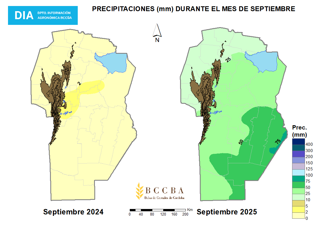 Durante septiembre de 2025 se registraron precipitaciones de variada intensidad en la provincia de Córdoba, con los mayores acumulados concentrados en el sector centro y sudeste. En gran parte del territorio, los registros se mantuvieron dentro de los valores normales para el mes, aunque en áreas de los departamentos Marcos Juárez, Unión y Presidente Roque Sáenz Peña se observaron los mayores acumulados departamentales.