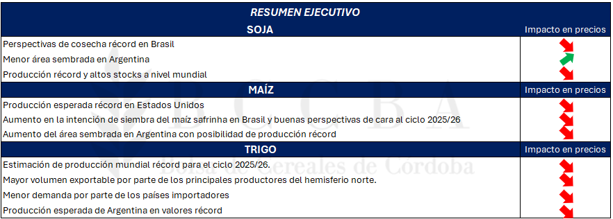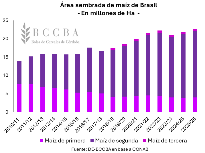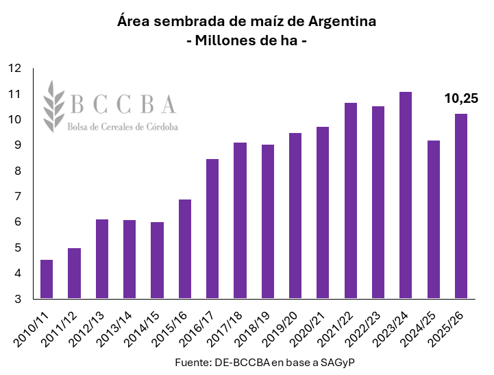En Argentina, la Secretaría de Agricultura, Ganadería y Pesca de la Nación, mantuvo sin cambios la estimación de siembra 2025/26 en 10,25 millones de hectáreas, marcando una recuperación del 11,4% respecto a la campaña anterior. Considerando que un 80% del área se cosecha como grano con destino a uso comercial y el 20% restante se contabilice como pérdida y silaje, con un rinde promedio la producción podría superar los 57 millones de toneladas.