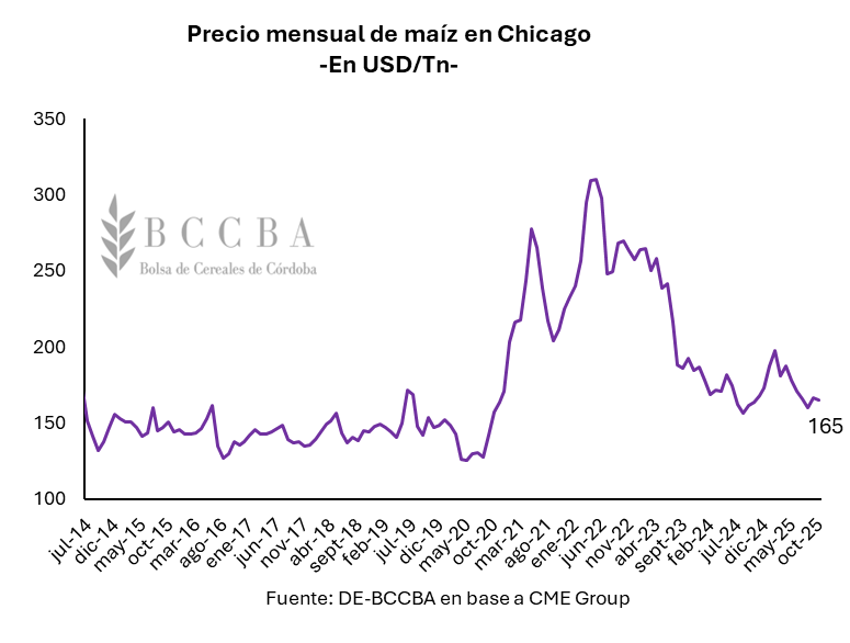 En este contexto, el precio promedio del cereal en Chicago se posiciona en USD 165/Tn, el cual, se encuentra en niveles similares a la cotización del mismo periodo del 2024. Además, al igual que en el caso de soja, al corto plazo no se exhiben fundamentos que posibiliten subas generalizadas en el corto plazo.
