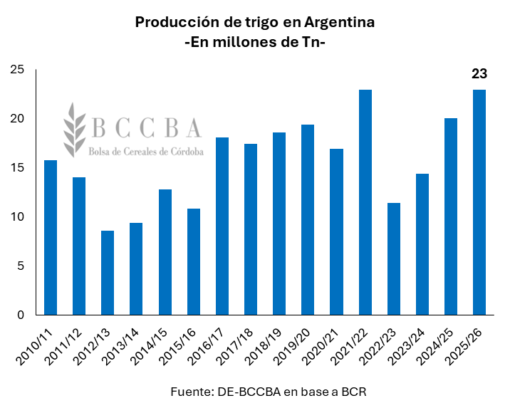 La producción de trigo en Argentina se ubicaría en 23 millones de toneladas de acuerdo con el último reporte de la Bolsa de Comercio de Rosario, casi 3 millones de toneladas más que la campaña 2024/25. Las buenas condiciones que atravesó el cultivo en gran parte del territorio durante su período crítico permitirían alcanzar un rinde de 35,4 qq/ha. Sin embargo, en Buenos Aires, principal provincia productora del cereal, se registrarían unas 210.000 hectáreas perdidas por excesos hídricos. En Córdoba y de acuerdo con datos del Departamento de Información Agronómica de la Bolsa de Cereales de Córdoba, la cosecha alcanzaría un volumen de 5,9 millones de toneladas como consecuencia de un rinde promedio récord de 35 qq/ha.