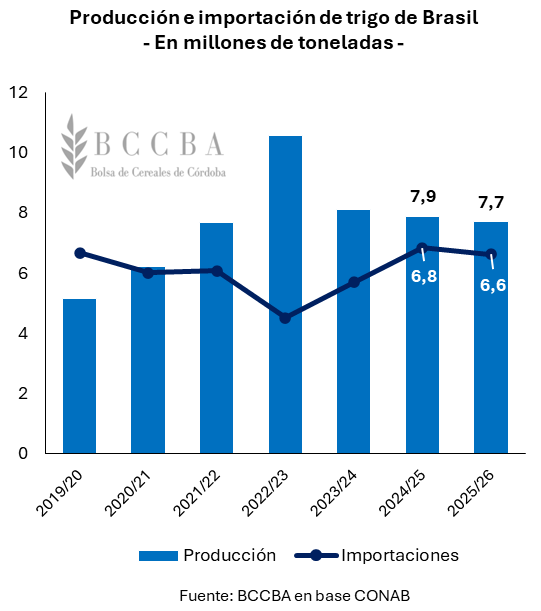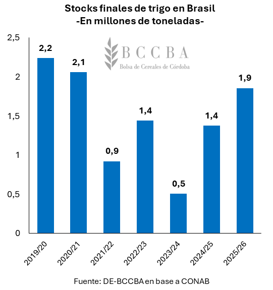 En cuanto a Brasil, la cosecha presenta un avance sobre el 38,4% del área destinada al cereal, la cual alcanzaría 2,4 millones de hectáreas. Dicha superficie, exhibiría una caída de casi un 20% en comparación al ciclo previo, no obstante, por una mejora en el rendimiento esperado de casi 5 qq/ha respecto al ciclo previo (31 qq/ha 2025/26 vs 26 qq/ha 2024/25) la producción no se vería tan afectada y se alcanzaría una cosecha de 7,7 millones de toneladas de trigo (-2,4% intercampaña). Mientras que, los stock finales serían los más elevados de las últimas 5 campañas y las importaciones serían similares a las del ciclo previo.