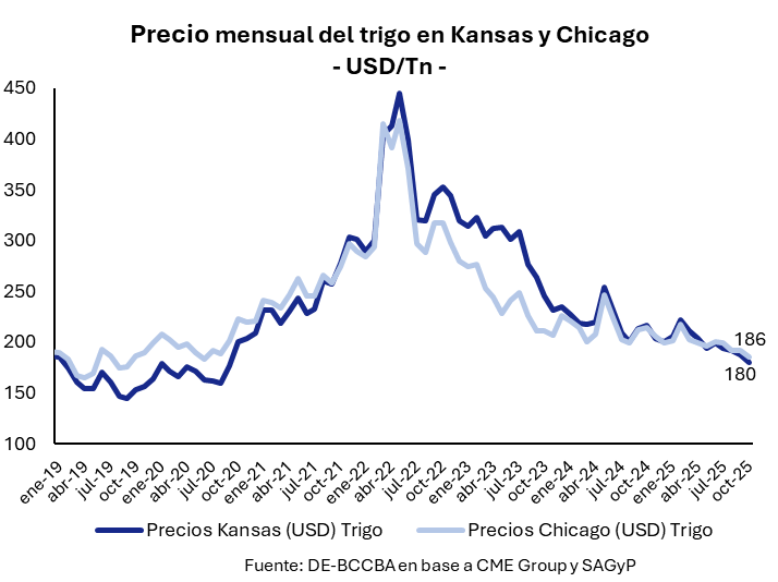 En estos momentos, se encuentra ingresando al mercado la cosecha proveniente del hemisferio norte, la cual se desarrolló bajo condiciones muy favorables en los principales países exportadores. Los cuales, según la última información disponible del USDA, inyectarían al mercado alrededor de 169 millones de toneladas del cereal durante el corriente ciclo comercial, 5,6 millones de toneladas por encima de los 163,4 millones de toneladas comercializados durante la campaña 2024/25 (+3,4% intercampaña). A su vez, el USDA preveía una cosecha récord de 816 millones de toneladas de trigo a nivel mundial, mientras que el ICG la ubicaría en 827 millones de toneladas. Además, algunos de los grandes compradores, como Egipto y Turquía, redujeron sus compras ante las mayores existencias internas. Dado este escenario, la cotización del cereal en Chicago en lo que va de octubre se ubica en USD 186/tn y en el mercado de Kansas en USD 180/tn. Reflejando caídas interanuales del 14% y 17% respectivamente en cada mercado.