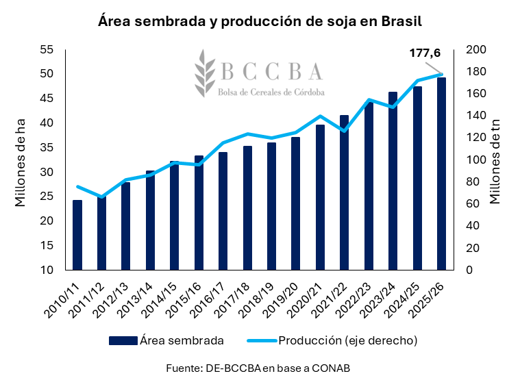 El panorama descripto en el párrafo previo genera cierta incertidumbre en el mercado, sin embargo, Brasil se encarga de disiparla. De cara al ciclo 2025/26, la Compañía Nacional de Abastecimiento (CONAB) prevé más de 49 millones de hectáreas destinadas para la soja, lo cual implicaría un aumento del 3,6% en comparación al ciclo 2024/25. Mientras que, de darse un rinde similar al observado durante el ciclo previo (36,2 qq/ha), la producción podría alcanzar un récord histórico de 177,6 millones de toneladas (+3,6% intercampaña).