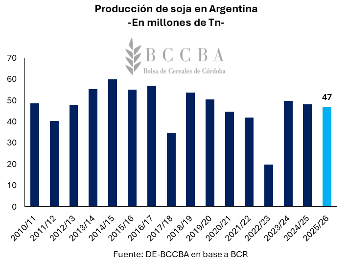 Por el lado de Argentina, la Secretaría de Agricultura, Ganadería y Pesca de la Nación (SAGyP) proyecta un área sembrada de soja que alcanzaría las 17,5 millones de hectáreas durante el ciclo 2025/26, implicando una caída del 3% respecto a la campaña 2024/25 (18 Mill Ha). Con lo cual, de darse un rendimiento en torno el promedio, la producción rondaría en los niveles observados durante las últimas campañas (alrededor de 47 a 50 millones de toneladas).