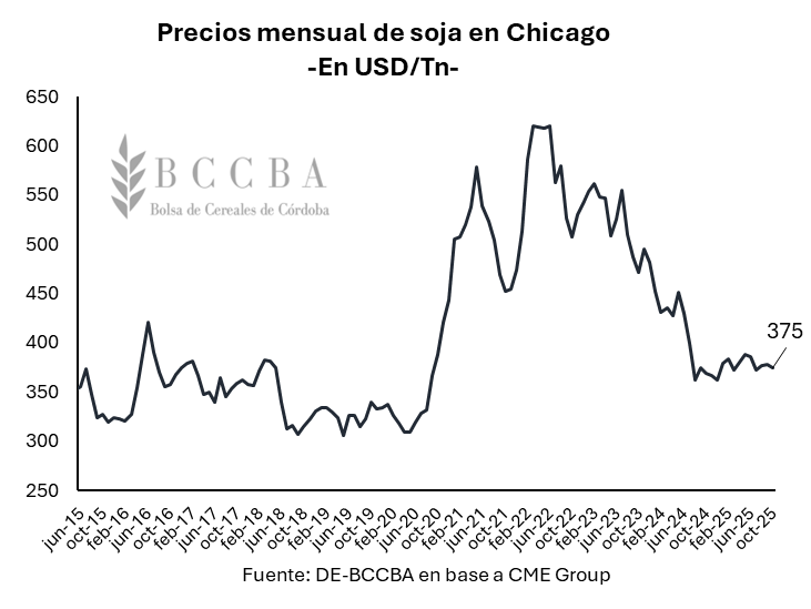 En este escenario, durante octubre la cotización promedio de la oleaginosa en el mercado de Chicago se ubica en USD 375/Tn, USD 5/Tn por encima del valor observado en el mismo periodo del 2024. No obstante, el precio continúa en una tendencia lateral y sin fundamentos para materializar subas generalizadas en el corto plazo como consecuencia del conflicto comercial entre China y Estados Unidos, lo cual se evidencia en menores embarques hacia el país asiático del poroto, los cuales se originan en mayor medida en Brasil y Argentina, generando un diferencial positivo para los productores sudamericanos. En este sentido, las exportaciones estadounidenses de poroto de soja, se encuentra por debajo de la campaña previa y del promedio de las últimas cinco campañas. De llegar a un acuerdo, el precio de la oleaginosa podría subir en Estados Unidos, aunque no necesariamente eso implique un traslado a los precios de exportación argentinos y brasileros.