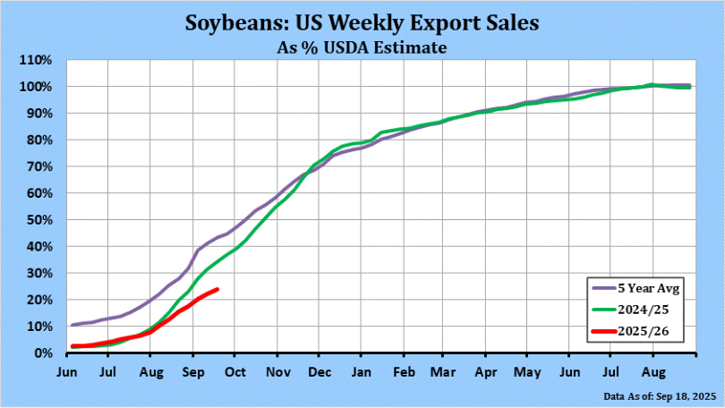 En octubre suele cosecharse una gran proporción de la soja estadounidense, no obstante, debido al cierre de la administración del Gobierno de los Estados Unidos no se han publicado los informes del Departamento de Agricultura de dicho país (USDA) con los datos correspondientes al avance de cosecha en las últimas semanas y las nuevas estimaciones de rendimientos y producción, dejando sin información oficial al mercado. En el informe de septiembre, el organismo norteamericano estimaba una producción de 117,1 millones de toneladas, la cual se ubicaría 1,7 millones de toneladas por debajo de lo obtenido durante el ciclo 2024/25 (118,8 Mill Tn). Sin embargo, la gran incógnita es si los rendimientos obtenidos son similares a los estimados, o habría algún tipo de corrección. Lo cual, es un dato no menor considerando el panorama ajustado en materia de stocks, ya que en septiembre la relación stock/consumo de soja para Estados Unidos se posicionó en un 6,9% y se ubicaría por debajo del promedio de las últimas 18 campañas (7,3%).