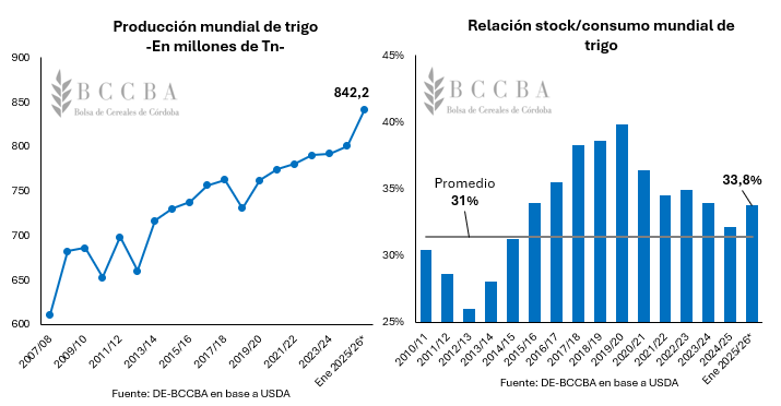 En el plano global, el USDA proyecta una producción récord de 842,2 millones de toneladas de trigo para el ciclo 2025/26, lo cual representa un incremento de 4,4 millones de toneladas respecto a su estimación de diciembre. Además, el organismo norteamericano incrementó los stocks finales estimados respecto al reporte previo, pasando de 275 millones a 278,3 millones de toneladas. En este escenario, la relación stock/consumo se ubicaría en el 33,8%, posicionándose 2,8 puntos porcentuales por encima del promedio histórico.