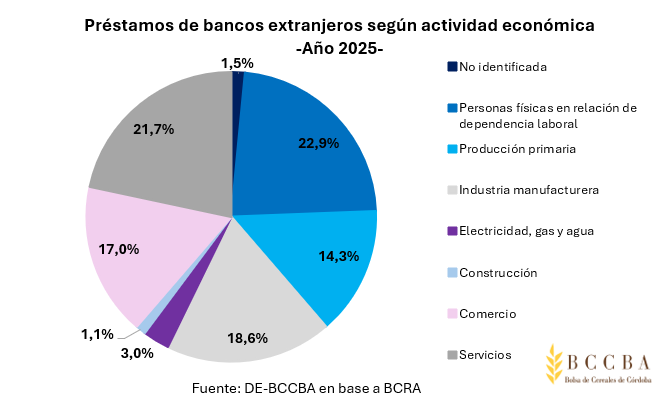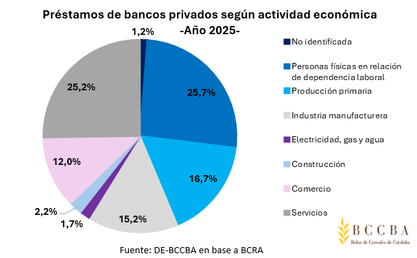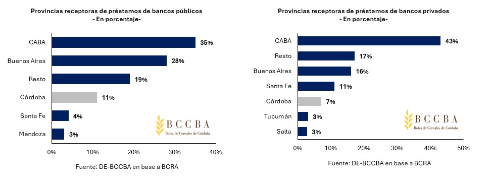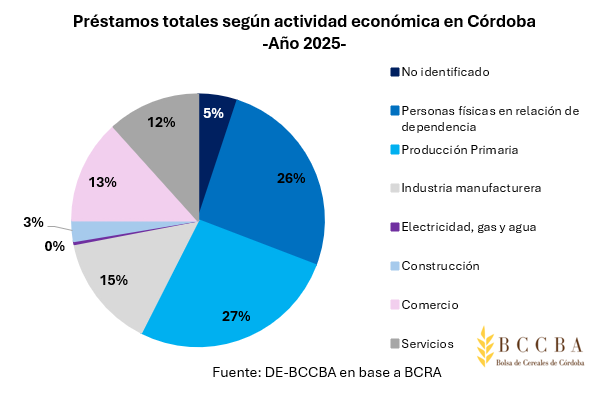 Durante el 2025, en Córdoba, el 45% de los préstamos provino de bancos públicos, el 34% de privados y el 21% de extranjeros. La principal actividad receptora fue la producción primaria con el 27% del total, que representó un monto de $2.528 miles de millones, seguido por las personas físicas (26%) y la industria manufacturera (15%).