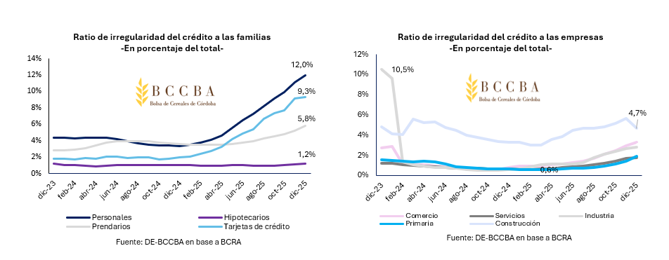 Para 2025 la irregularidad de la totalidad de la cartera crediticita de Argentina llegó al 5,5%, lo que refleja una alta morosidad, especialmente en tarjetas de crédito y préstamos personales, el cual alcanzó el máximo (12%) en diciembre de 2025. En cuanto a la actividad primaria, si bien se encontraba a la baja en los primeros meses del año pasado, experimentando solo un 0,6% de mora, para finales del año llegó al máximo de 1,9%.