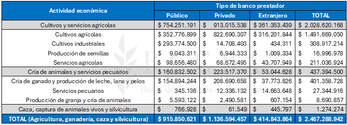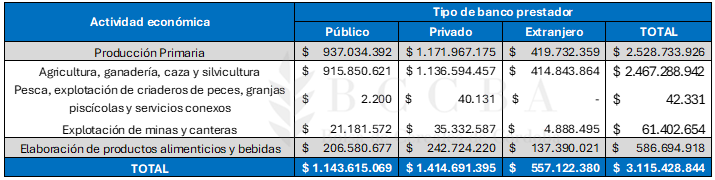 La producción primaria y la elaboración de productos alimenticios y bebidas recibió un total de $23.533 miles de millones, sumando el monto otorgado por bancos públicos, privados y extranjeros. Una particularidad es que, los bancos privados fueron los proveedores de los mayores montos para financiar estas actividades, seguido por los bancos extranjeros, y finalmente los públicos.