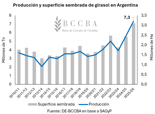 Según la Secretaría de Agricultura, Ganadería y Pesca de la Nación (SAGyP), durante la campaña 2025/26 el área sembrada de girasol a nivel nacional alcanzaría las 3,1 millones de hectáreas, 680.000 hectáreas por encima de la superficie observada durante el ciclo previo (2,4 mill ha). En cuanto a la producción, desde la entidad estiman una cosecha de 7,3 millones de toneladas, lo cual implicaría un crecimiento del 30% respecto a lo materializado en la campaña 2024/25 (5,6 mill Tn) y se posicionaría como un récord para el país.
