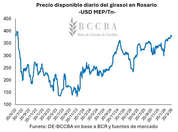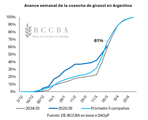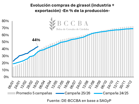 Por el lado de la comercialización, al 18 de febrero se llevan compradas 3,1 millones de toneladas de girasol proveniente de la campaña 2025/26, lo cual, representaría el 44% de producción a nivel nacional. Dicho avance, se posicionaría ocho puntos porcentuales por encima del observado durante el ciclo comercial 2024/25 (36%) a la misma fecha y al promedio de las últimas cinco campañas.