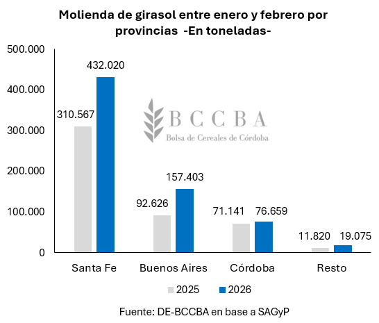 En cuanto a la molienda de la oleaginosa, como consecuencia del buen panorama productivo es de esperar que se observe mayor volumen. En este sentido, SAGyP estima que se industrializarán alrededor de 6 millones de toneladas durante el ciclo comercial 2025/26, un incremento interanual del 27% en el volumen total. A su vez, entre enero y febrero, ya han sido transformadas alrededor de 685.000 toneladas, registrándose una mayor molienda respecto al año previo en prácticamente todas las provincias que industrializan girasol.