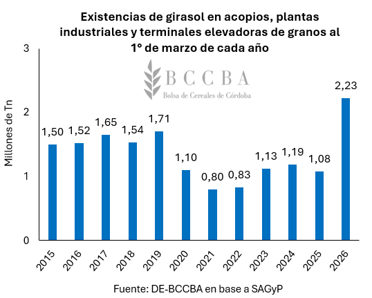 A su vez, las existencias de girasol en acopios, plantas industriales y terminales elevadoras de granos al primero de marzo alcanzaron los 2,23 millones de toneladas, el mayor volumen de los últimos once años.