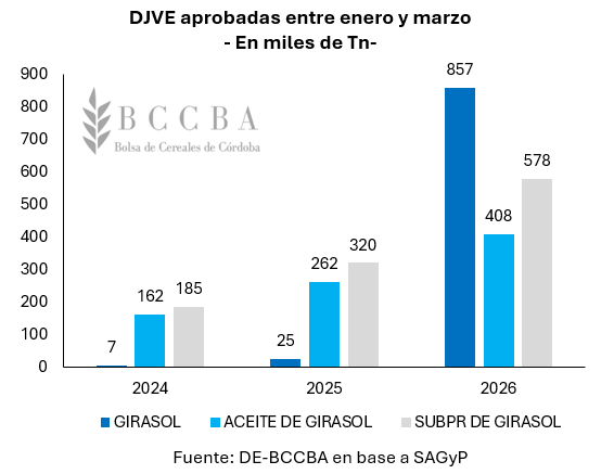 En lo que respecta al mercado externo, entre enero y marzo, han sido aprobadas declaraciones juradas por ventas al exterior (DJVE) por un total de 857.000 toneladas de semilla, 408.000 toneladas de aceite y 578.000 toneladas de harina de girasol. A partir de dichos tonelajes se puede inferir que, para hacer frente a dichos compromisos, serían necesarias alrededor de 3 millones de toneladas de semilla y, dicho volumen, se encuentra en línea con las compras realizadas al momento por los industriales y exportadores. De esta manera, la demanda local contaría con la materia prima necesaria para hacer frente a sus compromisos, al menos en el corto plazo.