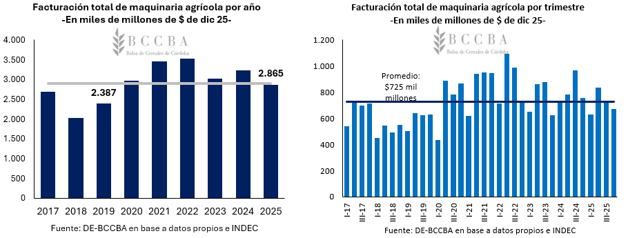 Durante 2025 se comercializaron 17.049 unidades de maquinaria agrícola, un 5% más respecto a 2024. Debido a una apertura de las importaciones y condiciones más competitivas en la economía aumentaron los ingresos de maquinarias del extranjero. A pesar del aumento de las unidades vendidas, la facturación en términos reales cayó un 11% en comparación al año previo.
