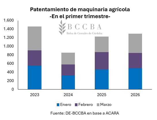 En el primer trimestre del corriente año, se registraron 1.291 unidades, un 5% más que el primer trimestre de 2025. Con este inicio de año, las perspectivas son positivas de cara a los próximos meses, acompañadas por variables económicas más estables, mayor acceso al crédito y una perspectiva favorable de la campaña agrícola. Sin embargo, algunos elementos que pueden generar controversias en el mercado es la entrada de nuevas marcas a menores precios y maquinaria importada usada, que puede generar competencia con la oferta local.