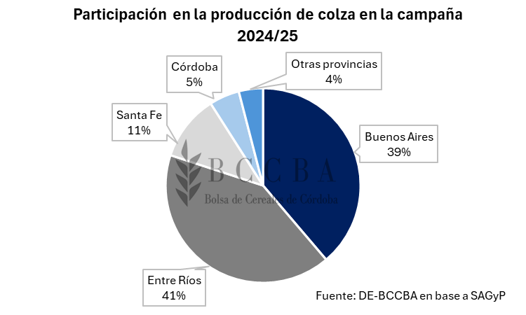 Además, para la campaña 2024/25, la producción de la oleaginosa se concentró principalmente en Entre Ríos con el 41% y en Buenos Aires con el 39%, con una menor participación se ubicaron las provincias de Santa Fe y Córdoba con el 11% y 5%, respectivamente.