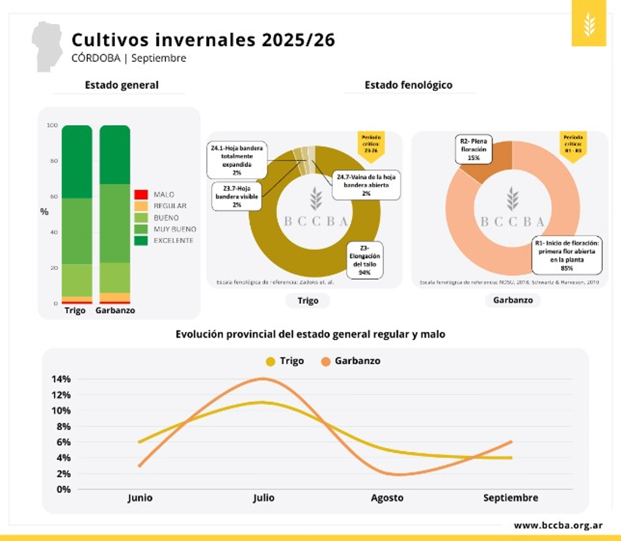 El estado general de los cultivos fue en su mayoría excelente y muy bueno, aunque se observó un leve aumento de la superficie en condiciones regulares o malas. Esto se atribuyó a excesos hídricos, de leves a moderados, en el este provincial para trigo, y a heladas que afectaron principalmente al garbanzo. Al momento del relevamiento, el trigo se encontraba mayormente en elongación del tallo, con toda la superficie en período crítico. El garbanzo también atraviesa su etapa crítica, con la mayoría de los lotes en R1. Se registraron episodios de bajas temperaturas al inicio de la floración, complicando el cuajado en departamentos como Totoral, Río Seco y Río Primero.