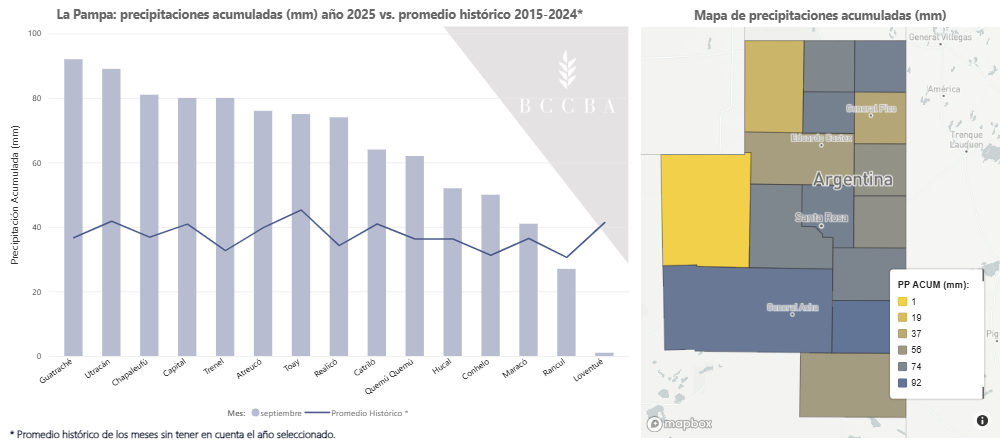 Durante septiembre, las precipitaciones fueron superiores a lo normal en casi toda la zona relevada, llegando a duplicar los acumulados históricos en varios sectores. Esta mejora se refleja en la mayor disponibilidad de agua útil en el perfil. Según el SMN, para los próximos tres meses se prevén precipitaciones dentro de los valores normales, mientras que las temperaturas tenderían a ubicarse por encima del promedio.