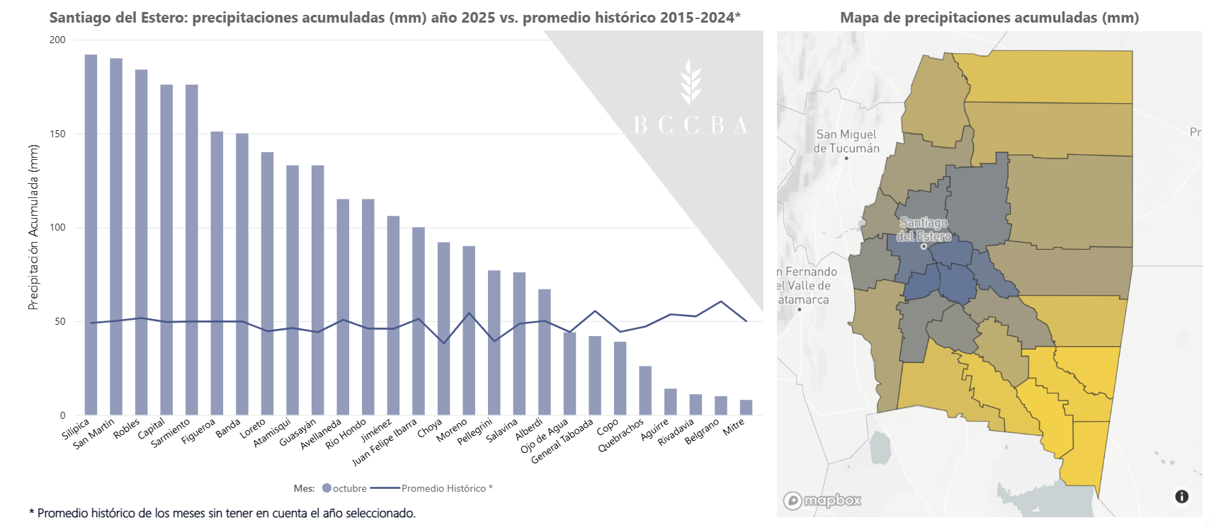 De acuerdo con la información del satélite GPM, las lluvias estuvieron por encima del promedio en casi la totalidad de los departamentos. Los mayores acumulados se observaron en la franja centro‑norte, con picos en Silípica, San Martín y Robles, seguidos por Capital y Sarmiento.