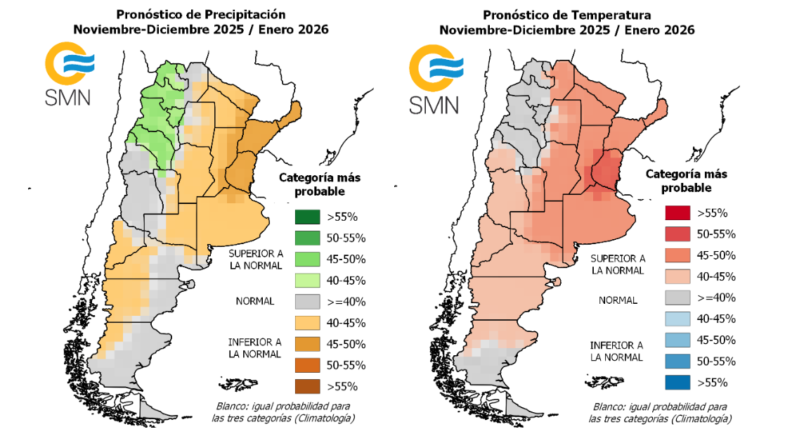 Según el pronóstico trimestral del Servicio Meteorológico Nacional (SMN) para el período noviembre–diciembre de 2025 y enero de 2026, en Santiago del Estero se prevén precipitaciones inferiores a lo normal. En cuanto a las temperaturas, se espera un trimestre más cálido de lo habitual en la mayor parte del territorio provincial, con alta probabilidad de valores superiores a lo normal.