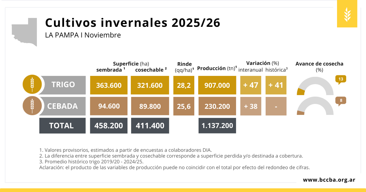 En noviembre, la cosecha de trigo y cebada comenzó a tomar ritmo en La Pampa y la primera lectura de los lotes trillados confirma muy buenos resultados productivos. A pesar del aumento en la superficie perdida por heladas y del estrés hídrico en las etapas finales del ciclo, la producción total de invernales se estima en 1,1 millones de toneladas y el trigo se encamina a marcar un récord.