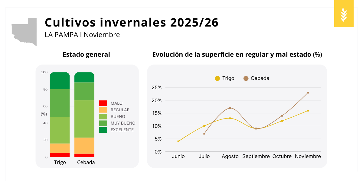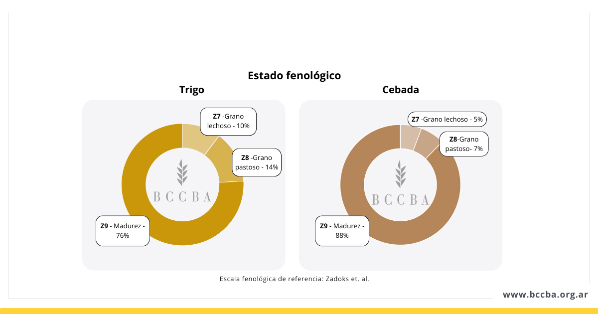 Ambos cultivos superaron el período crítico y se encuentran mayormente en llenado de granos y madurez fisiológica. Aunque cerca del 80 % de los lotes se mantienen entre buenos y excelentes, se observó un aumento en la proporción de lotes regulares y malos, especialmente en cebada. Según los técnicos zonales, esta situación se vincula a la combinación de estrés por heladas y déficit hídrico, este último más frecuente hacia fines del mes.
