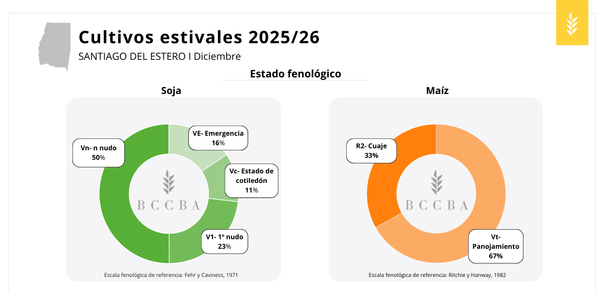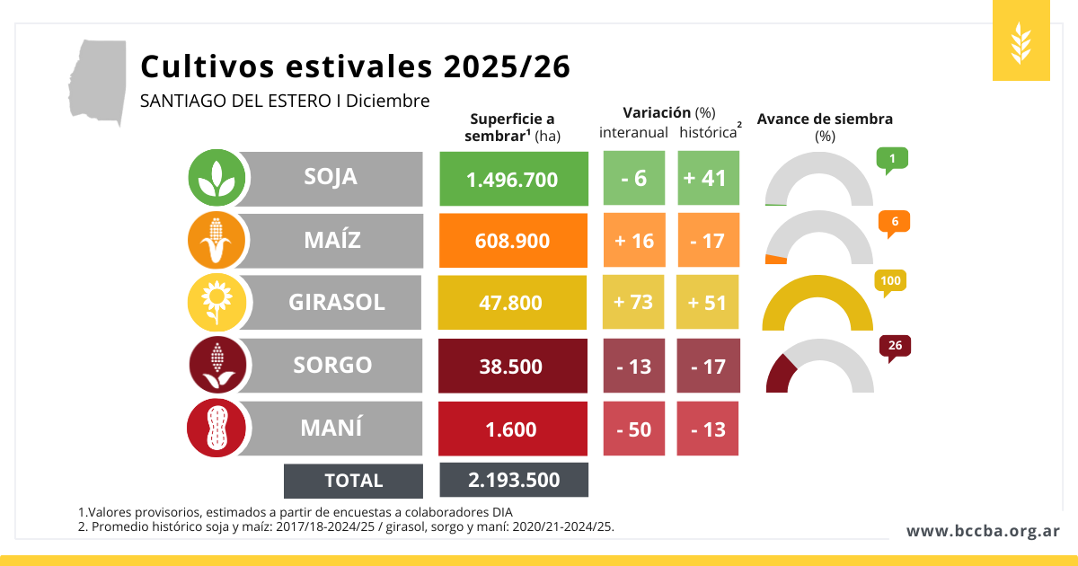 El avance de siembra de los cultivos estivales continúa siendo bajo y, en general, no presenta cambios significativos respecto de noviembre en soja y maíz, debido a la falta de humedad. En la zona de Bandera, para la soja se prevén resiembras de lotes implantados en agosto afectados por granizo. El sorgo muestra un mayor avance respecto de noviembre, alcanzando el 26% de superficie sembrada, aunque la labor continúa demorada en términos interanuales e históricos.