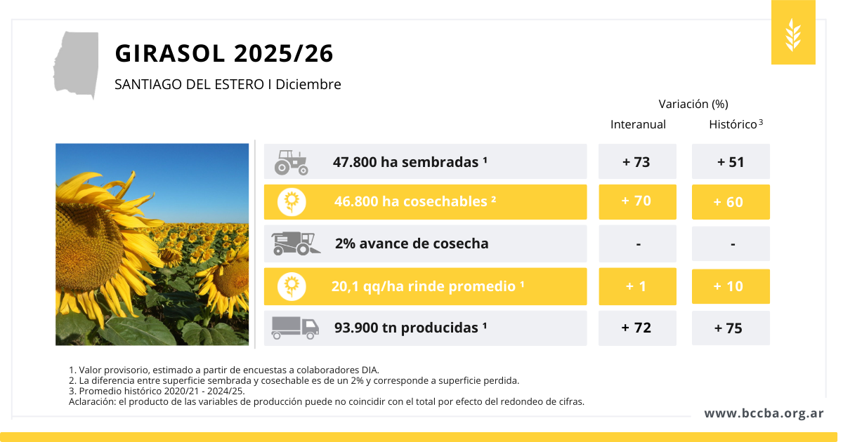 El girasol, por su parte, finalizó la siembra en noviembre y ya presenta un incipiente avance de cosecha. Las estimaciones mostraron perspectivas positivas tanto en rendimiento como en producción, superando los valores de la campaña anterior y el promedio histórico, con una producción que se ubica alrededor de un 70% por encima de ambos registros, principalmente impulsada por el aumento de la superficie sembrada. La superficie perdida se mantiene acotada, cercana al 2%, principalmente por sequía y granizo.