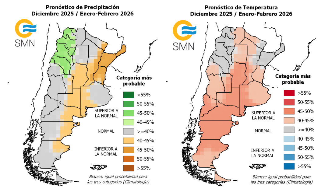 Según el nuevo pronóstico trimestral del SMN para los meses de diciembre 2025, enero y febrero 2026 se esperan lluvias cercanas a los promedios y temperaturas por encima de lo normal.