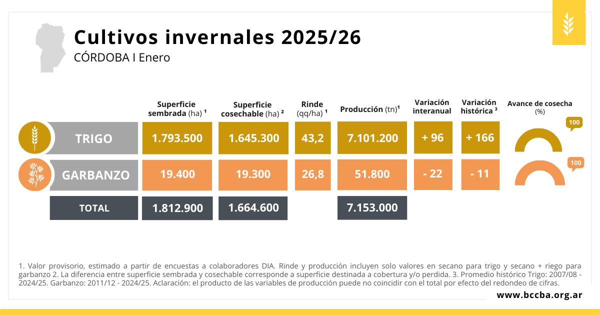 Este contexto climático favorable se reflejó en los rindes obtenidos, que alcanzaron los valores más altos desde que la Bolsa de Cereales de Córdoba dispone de registros para ambos cultivos.