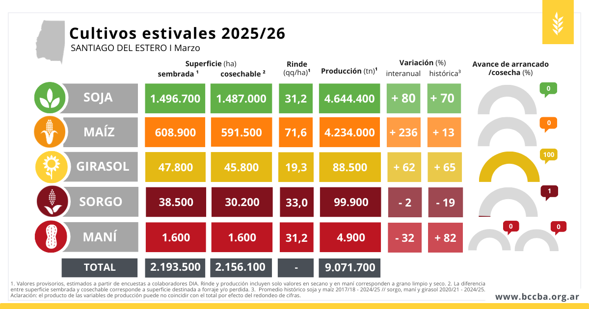 En producción, las proyecciones iniciales muestran una mejora marcada en soja y, especialmente, en maíz, con volúmenes que superarían tanto a la campaña previa como a sus promedios históricos. Por el contrario, en maní y sorgo la reducción del área sembrada se traduciría en producciones inferiores a lo obtenido en la campaña previa. En girasol, con la cosecha finalizada, el aumento del área implantada permitió alcanzar el mayor volumen producido dentro de la serie relevada por la BCCBA, aun en un contexto climático poco favorable para el desarrollo del cultivo.