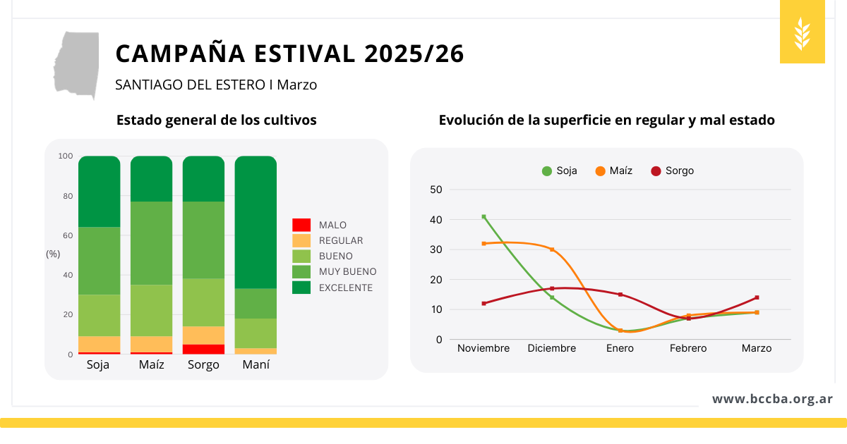 En este contexto, respecto de febrero se registró un leve incremento en la proporción de lotes en condición regular y mala en los cultivos aún en pie.
