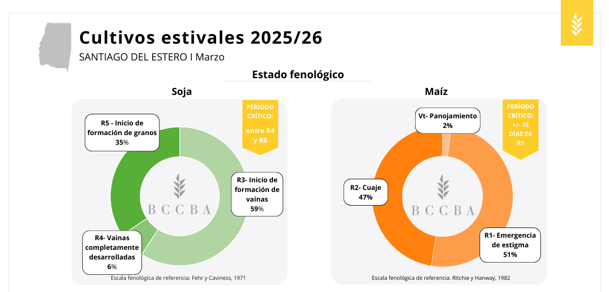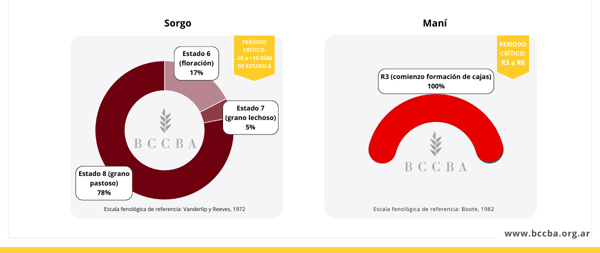 Al momento del relevamiento, los cultivos aún en pie atravesaban etapas fenológicas clave para la definición del rendimiento. En maíz y maní, la mayor parte de la superficie se encontraba en período crítico, una fase de alta sensibilidad frente a la disponibilidad hídrica y las temperaturas elevadas. En soja, en cambio, una proporción importante del área aún no había ingresado plenamente en esta etapa, aunque en los lotes más avanzados ya se iniciaba la formación de granos. En sorgo, gran parte de los lotes transitaba estadios avanzados, con buena parte del rendimiento ya determinado. En este contexto, las lluvias de comienzos de marzo resultaron oportunas para sostener la evolución de los cultivos.