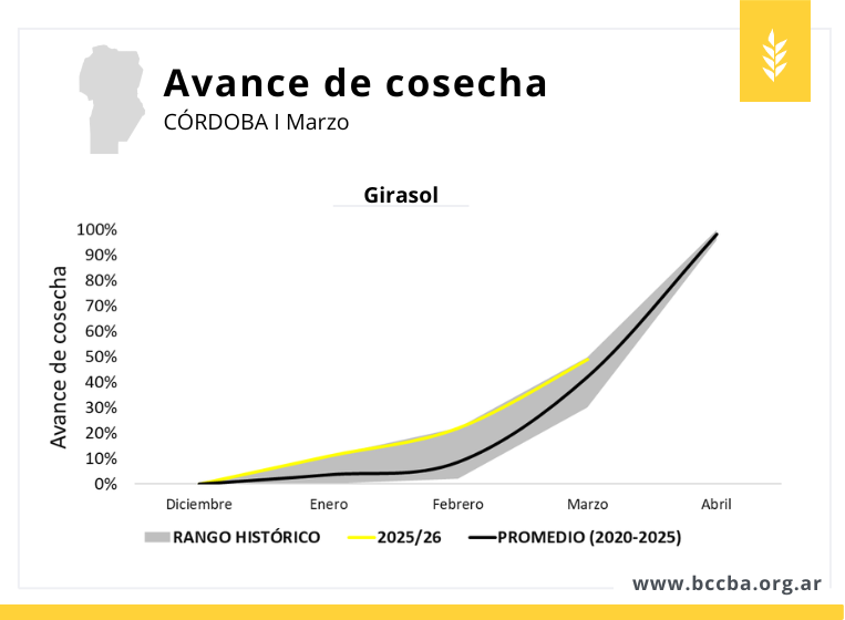 En una nueva estimación de producción, se registraron mejoras en los rindes esperados para todos los cultivos, con excepción del girasol, cuyo rinde se ajustó a la baja respecto del informe anterior. Este cultivo presentaba un avance de cosecha cercano al 50% y una producción estimada similar a la obtenida en la campaña pasada. Colaboradores reportaron rindes muy variables; en el departamento Río Cuarto, por ejemplo, se mencionaron casos de estrés por anegamiento en algunos sectores, déficit hídrico en otros y lotes con rendimientos superiores a los promedios zonales.