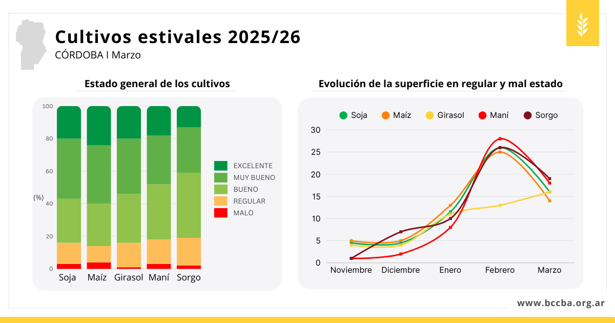 En cuanto a la fenología, la soja y el maní aún se encontraban en mayor proporción en período crítico, por lo que los rendimientos definitivos dependerán de la evolución climática en las próximas semanas. En maíz, girasol y sorgo, en cambio, ya se había superado la etapa de definición de rendimiento y la producción se ajustará progresivamente con el avance de la cosecha.
