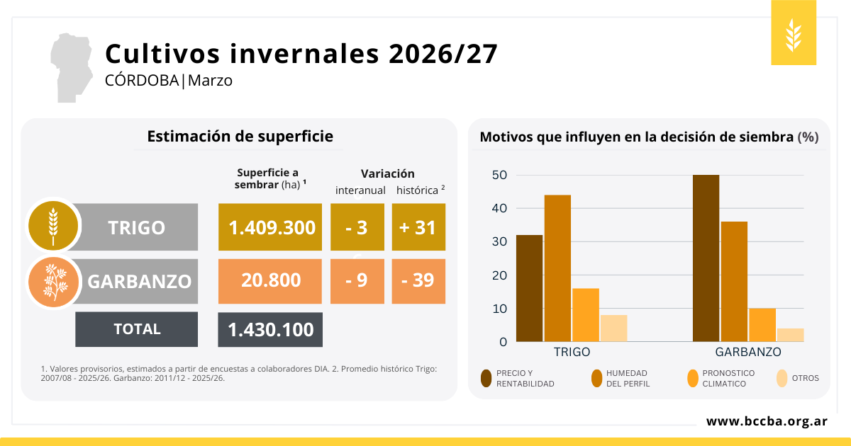 Se realizó la primera estimación de superficie de cultivos invernales 2026/27 para la provincia de Córdoba. Tras una campaña que cerró con muy buenos resultados productivos, se espera para este nuevo ciclo una reducción en la superficie de trigo y garbanzo. Aunque la definición de la siembra invernal dependerá del comportamiento de las lluvias en las próximas semanas.