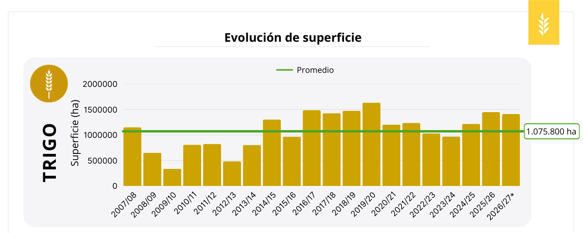 Para trigo, la superficie registraría una disminución interanual de 38 mil hectáreas. No obstante, el área sembrada se mantendría por encima del promedio histórico, en línea con lo observado desde la campaña 2024/25.
