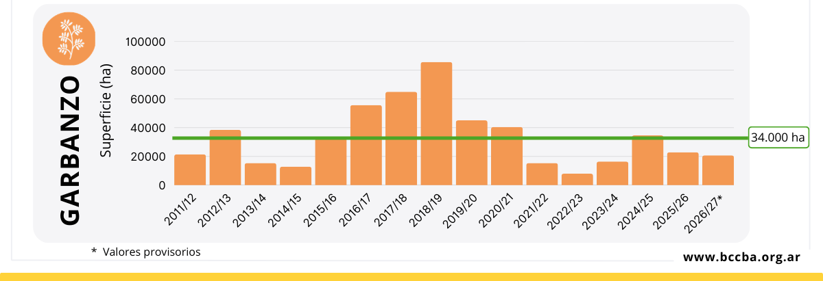 El garbanzo profundizaría la caída de superficie iniciada la campaña pasada, en un contexto de elevados niveles de stock que reducen la rentabilidad esperada del cultivo. Este factor fue señalado como el principal motivo que desalienta la siembra del cultivo. Dentro del componente rentabilidad, se incluye además la incertidumbre asociada al actual contexto geopolítico, que dificulta las rutas de comercialización y añade volatilidad al escenario de negocios para la especialidad.