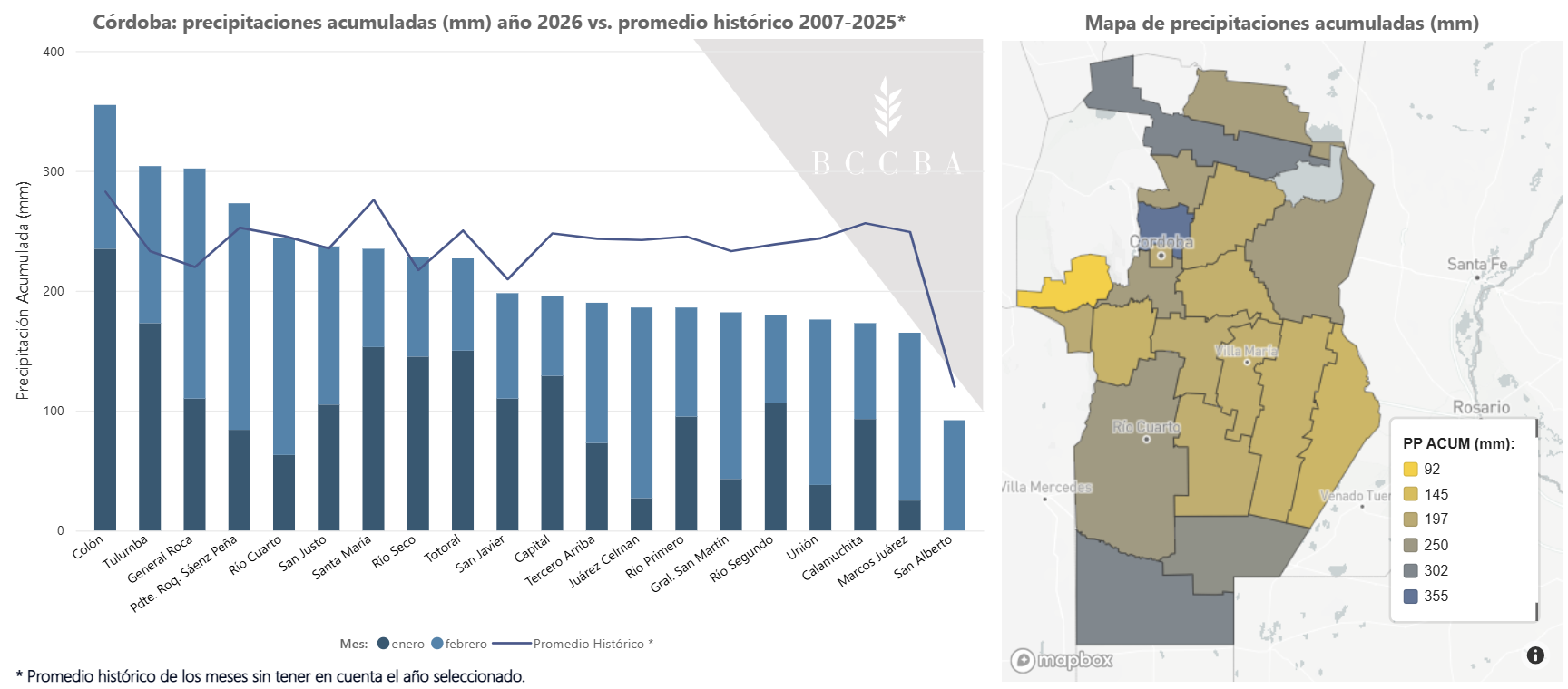 Durante los dos primeros meses del año, las precipitaciones se distribuyeron de manera heterogénea en la provincia. En la mayoría de los departamentos los acumulados se ubicaron por debajo de los promedios históricos, mientras que en otros los superaron ampliamente. Esta disparidad explica en parte la variabilidad observada en las tendencias de estimación de superficie entre las distintas zonas.