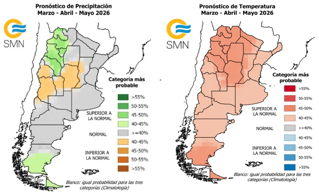 Respecto al pronóstico trimestral, para el otoño se prevén precipitaciones por debajo de lo normal en la mayor parte del territorio provincial y temperaturas superiores a los valores medios. Estos meses son clave para la recarga de los perfiles, ya que los lotes comienzan a liberarse y, a partir de mayo, se inicia la siembra de los cultivos invernales.