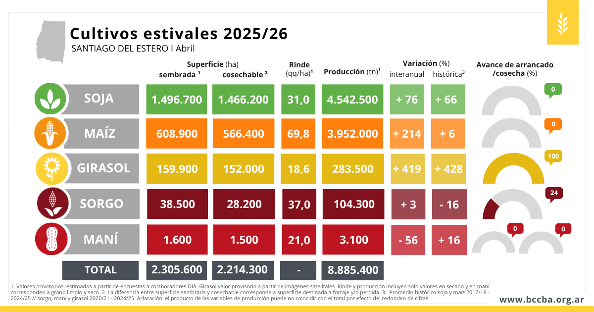 Con una nueva estimación productiva y el inicio de la cosecha en sorgo, se ajustan las proyecciones de la campaña estival en Santiago del Estero. Las condiciones ambientales del período impactaron en los rindes de maíz, soja y maní, mientras que el sorgo mejora su desempeño y el girasol consolida una producción récord.