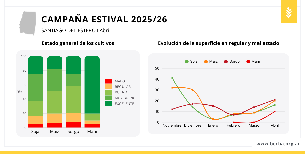 En cuanto al estado general, respecto de marzo se observó un aumento en la proporción de lotes en condición regular y mala en todos los cultivos aún en pie. En términos generales, esta evolución se vinculó a la ocurrencia de excesos hídricos y anegamientos, así como a períodos de déficit hídrico y elevadas temperaturas, según la zona analizada.