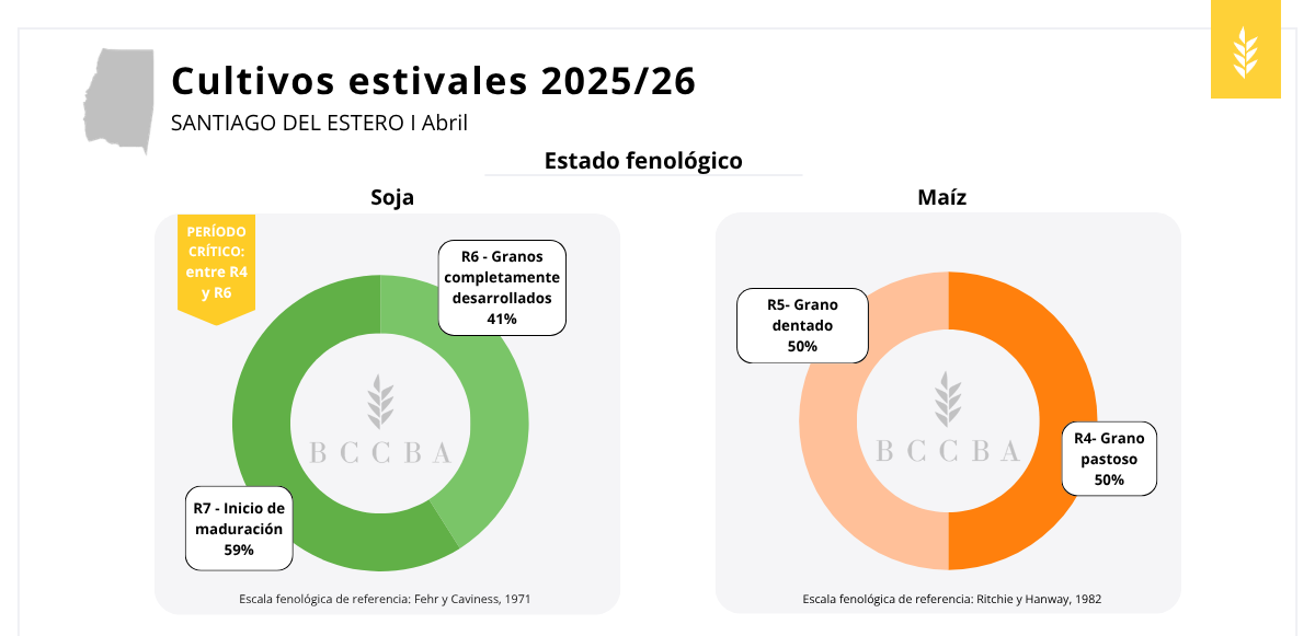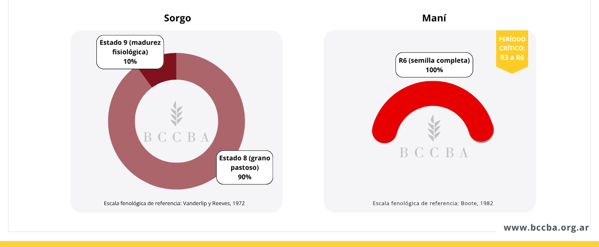 Al momento del relevamiento, los cultivos aún en pie transitaban etapas fenológicas clave. En soja, aunque más de la mitad de la superficie ya había iniciado la maduración, una proporción importante permanecía en período crítico. En maíz y sorgo predominaba el llenado de granos, con una pequeña superficie de sorgo comenzando la madurez, mientras que en maní se encontraba en semilla completa.