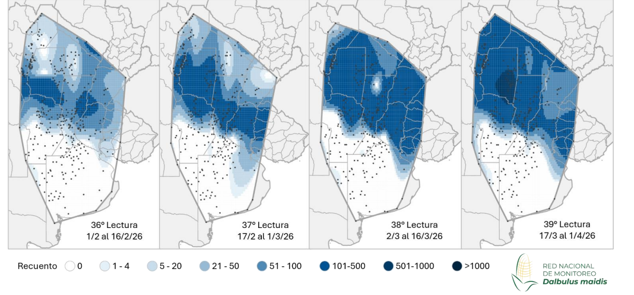 En el informe N° 39 de la Red Nacional de Monitoreo se destacó la presencia de chicharrita (Dalbulus maidis), las mayores abundancias se concentraron en las regiones endémicas del NOA y NEA, junto con el centro-norte del país, lo que refuerza la necesidad de mantener un monitoreo permanente ante el riesgo asociado al complejo de achaparramiento del maíz.