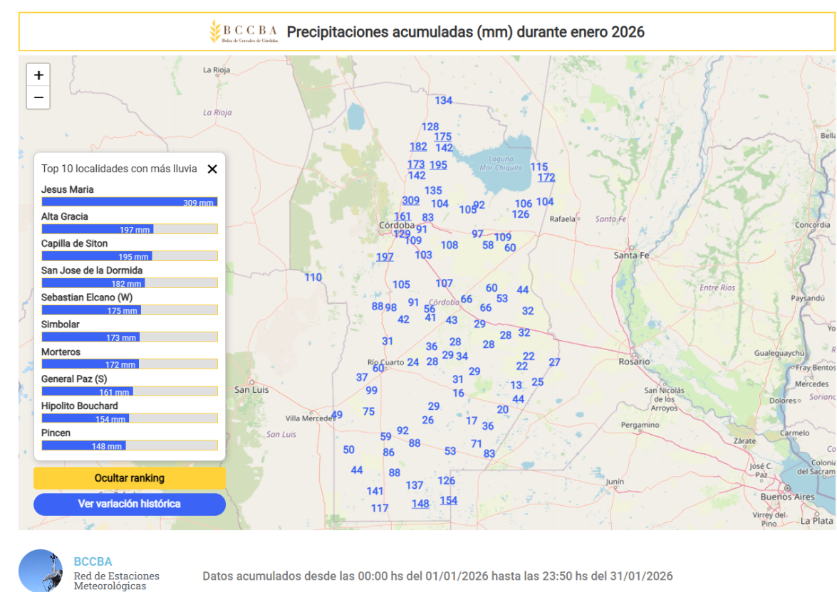 Nuestra Red de Estaciones Meteorológicas de la BCCBA puede ser consultada en: Acceso-Estaciones Meteorológicas de la Bolsa de Cereales de Córdoba